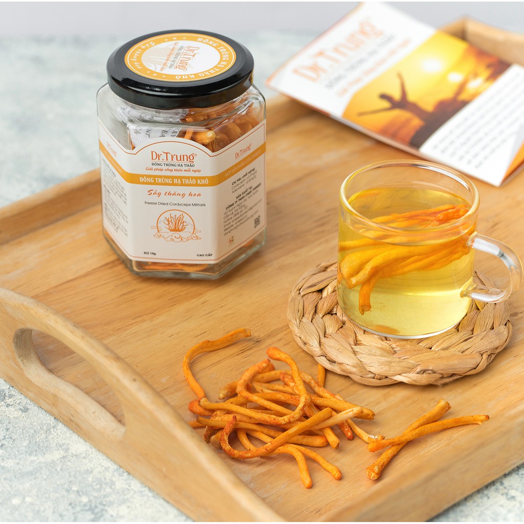 - Pha trà: Bắt đầu mỗi ngày sau khi thức dậy bằng việc thưởng thức 1 ly trà Đông Trùng Hạ Thảo thật tuyệt vời. Pha 7-9 sợi nấm với nước ấm ( 85oC) ủ kín trong 5-10p, dùng luôn khi ấm, ăn cả sợi nấm.